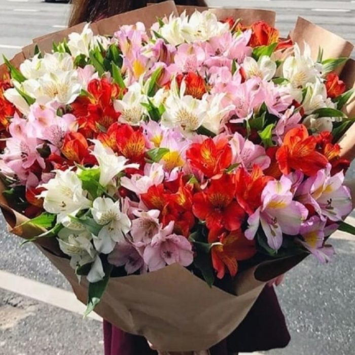 Альстромерия Микс Европа – 45 шт.Упаковка дизайнерская – 3 шт.Лента атласная – 1 шт.