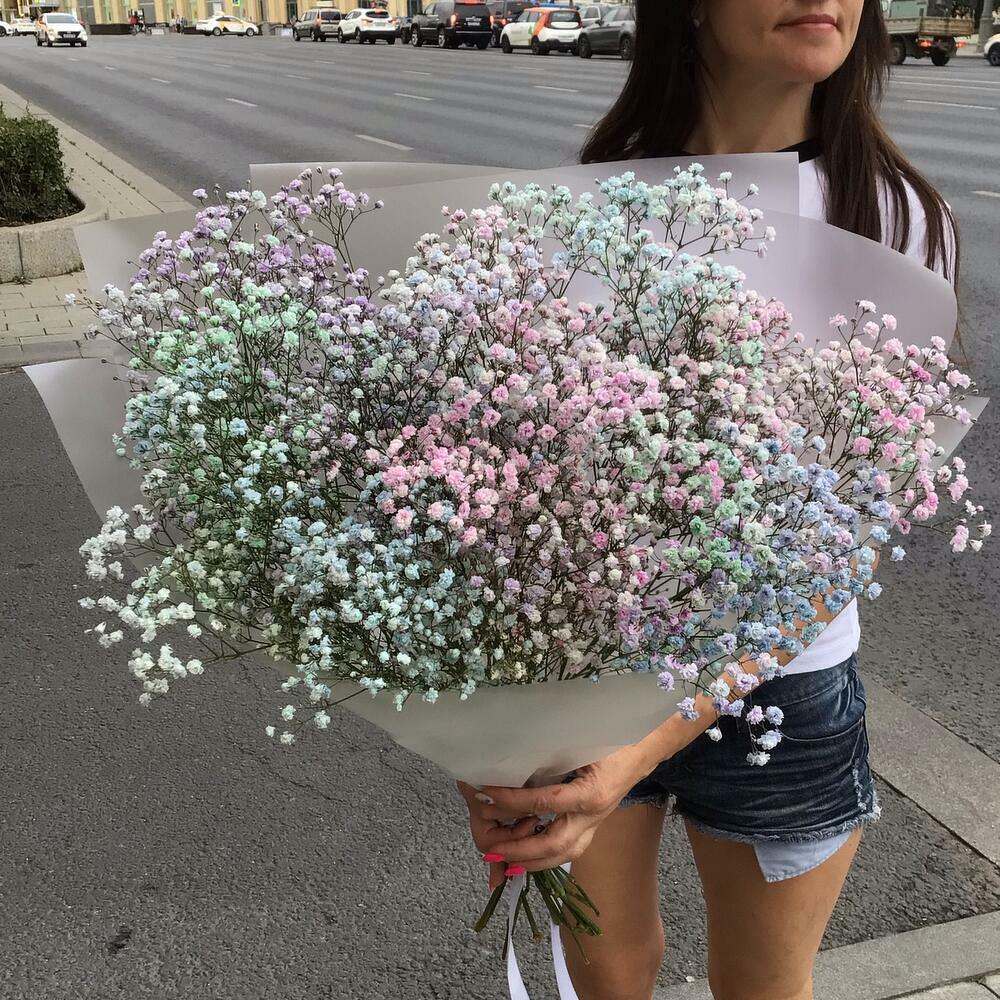 Гипсофила голубая – 4 шт.Гипсофила розовая – 4 шт.Гипсофила фиолетовая – 3 шт.Пленка – 2 шт.Лента – 1 шт.