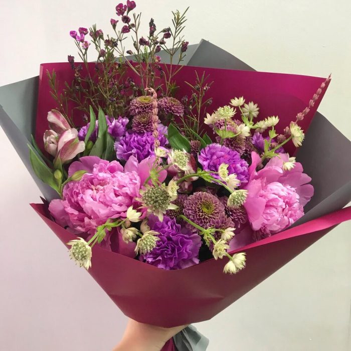 Альстромерия – 2 шт.Лаванда – 2 шт.Пион – 2 шт.Хризантема Сантини – 3 шт.Гвоздика – 5 шт.Хамелациум – 1 шт.Астранция – 2 шт.Открыточка с вашими пожеланиями – 1 шт.Авторская упаковка – 1 шт.