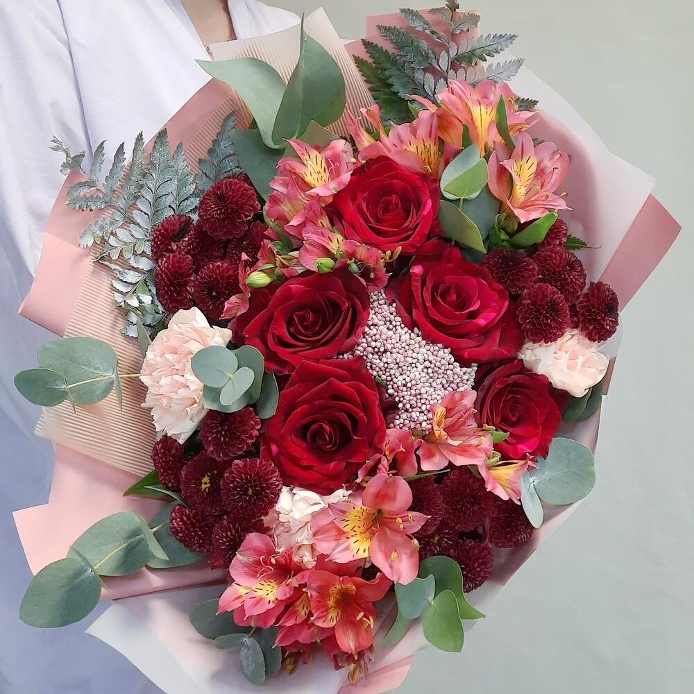 Альстромерии, Гвоздики, Кустовые розы, Лизиантусы, Розы, Хризантемы