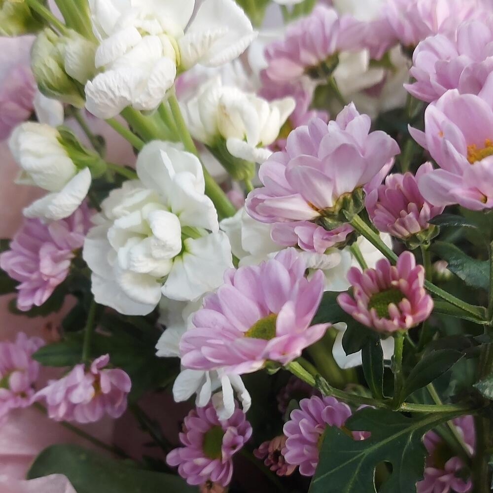 Маттиола – 3 шт.Хризантема кустовая – 5 шт.Упаковка тишью – 1 шт.Упаковка крафт – 1 шт.Лента атласная – 1 шт.