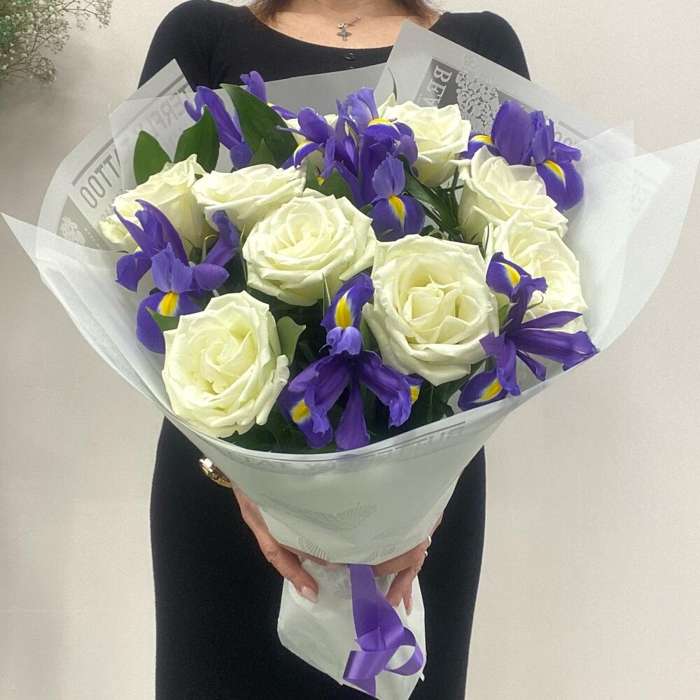 розы – 9 шт.ирисы – 6 шт.Рускус сочи – 9 шт.Упаковка дизайнерская – 1 шт.Лента – 1 шт.