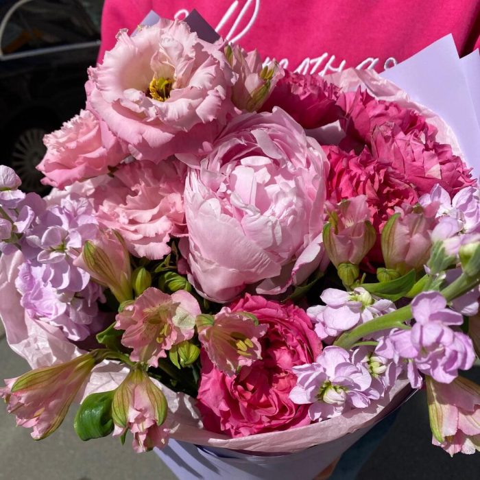 Альстромерия – 2 шт.Лизиантус – 1 шт.Маттиола – 3 шт.Пион – 1 шт.Роза пионовидная кустовая – 2 шт.Фисташка – 3 шт.Упаковка дизайнерская – 1 шт.