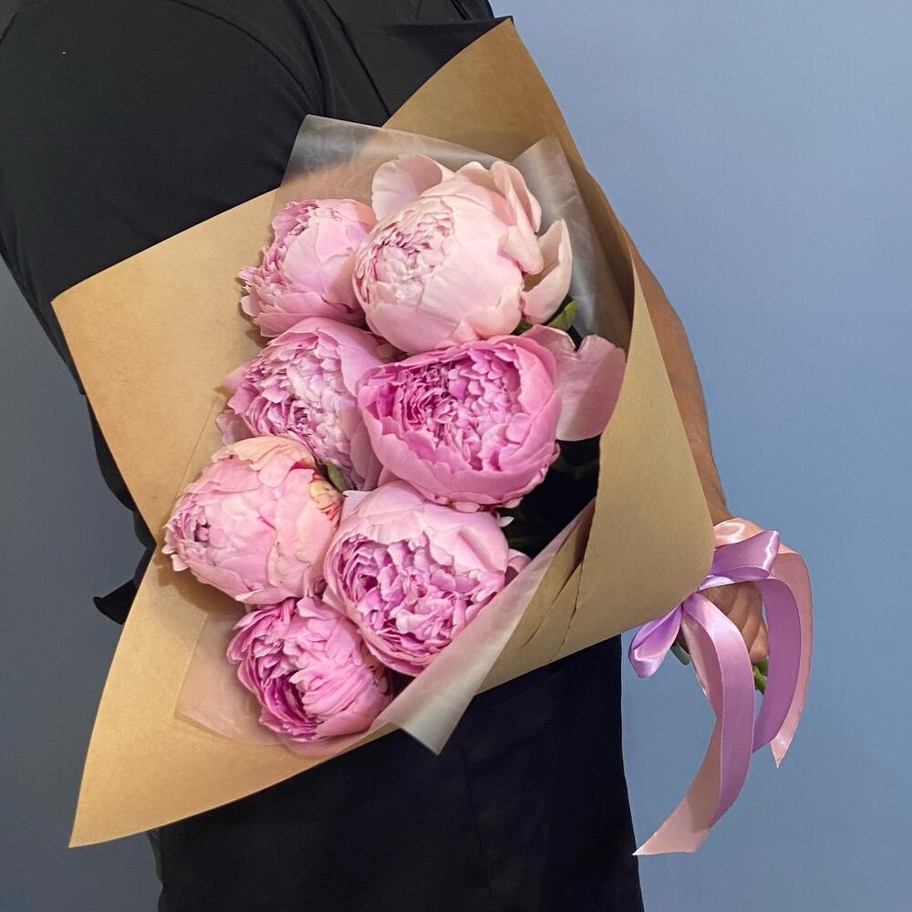 Атласная лента – 1 шт.Пион розовый – 7 шт.Упаковка крафт – 1 шт.