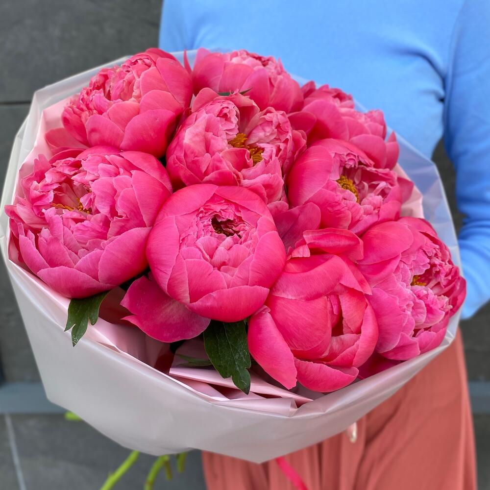 Лента атласная – 1 шт.Упаковка дизайнерская – 2 шт.Пион коралл шарм – 9 шт.
