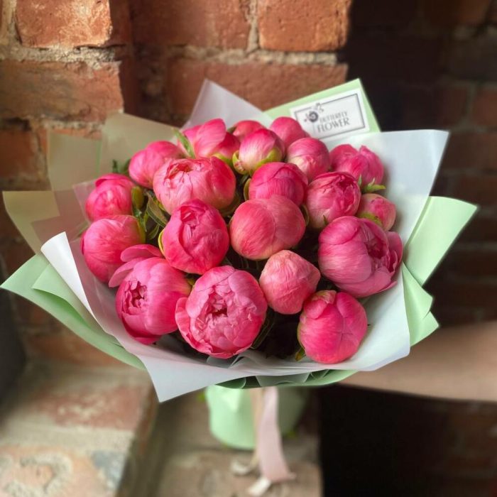 Букет из 21 кораллового пиона в дизайнерской упаковке “Коралл Саншайн”