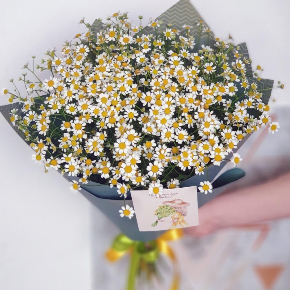 Лента атласная – 2 шт.Ромашка кустовая – 15 шт.Крафт упаковка – 2 шт.Открыточка с вашими пожеланиями – 1 шт.