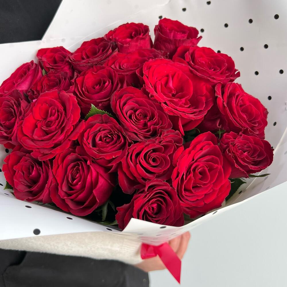 Лента атласная – 1 шт.Упаковка дизайнерская – 2 шт.Роза 40 см – 21 шт.