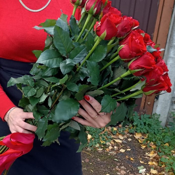 роза россия красная 70 см – 35 шт.Лента атласная – 2 шт.
