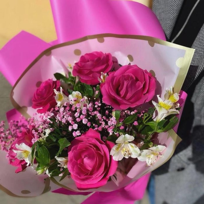 Роза Эквадор – 5 шт.Альстромерия – 3 шт.Гипсофила – 1 шт.Пистация – 3 шт.Корейская пленка – 1 шт.Лента – 1 шт.