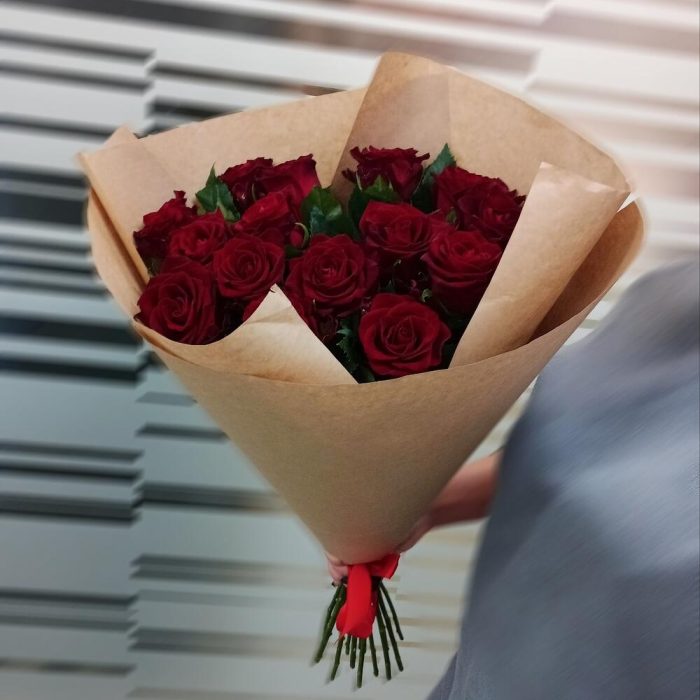 Букет из 15 красных роз Ред Наоми длиной 60 см в упаковке крафт