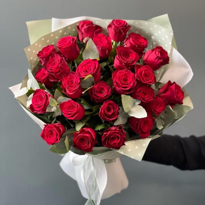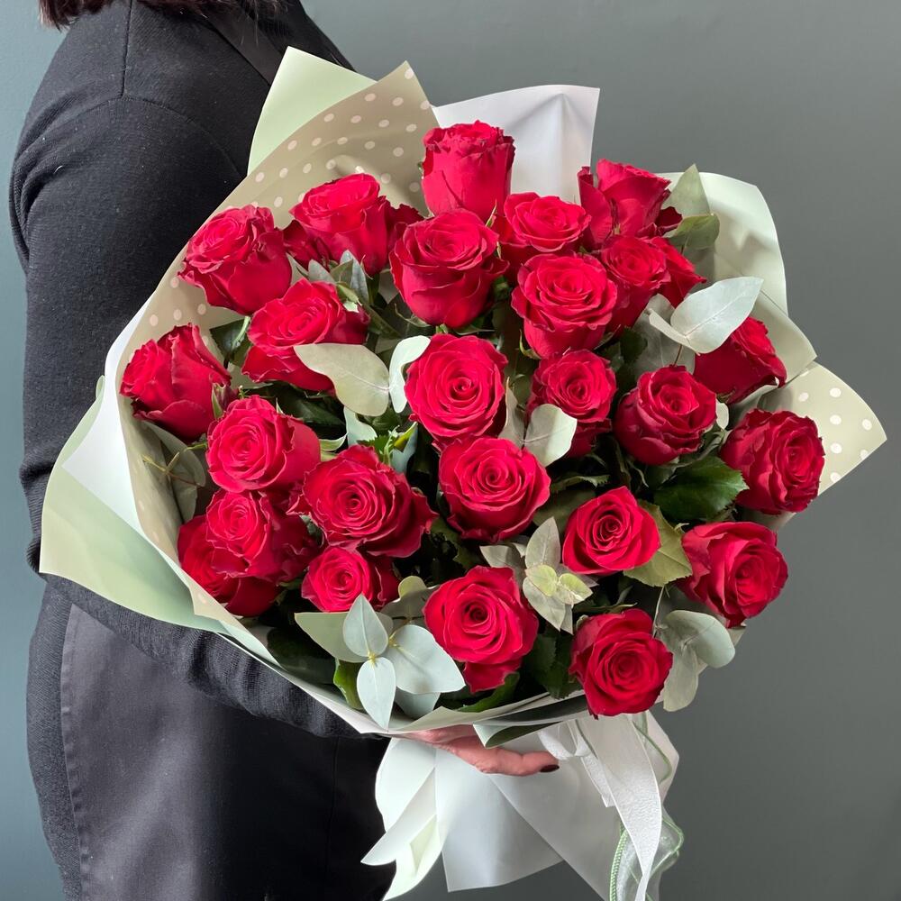 Роза одноголовая – 25 шт.Эвкалипт – 3 шт.бумага упаковочная – 1 шт.Лента – 1 шт.