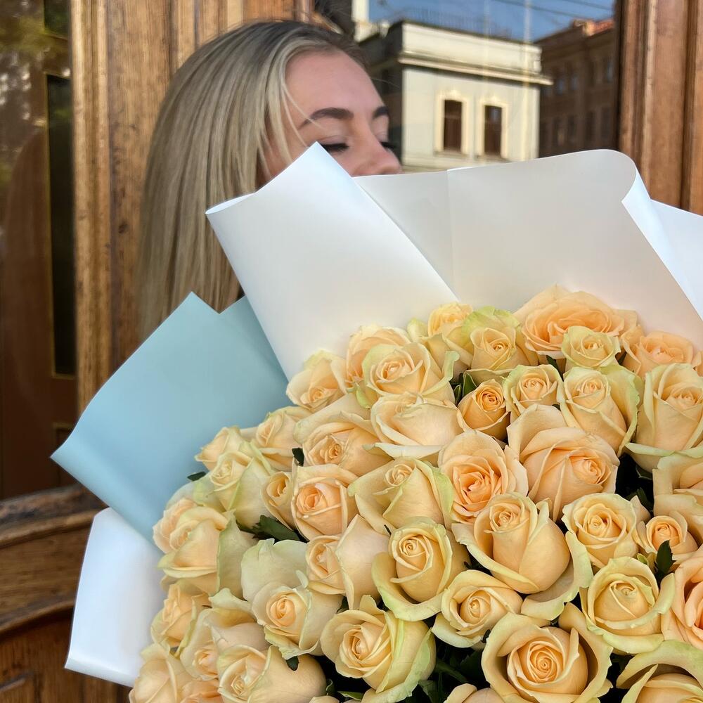 роза персиковая 60 см – 61 шт.Дизайнерская упаковка – 5 шт.Лента атласная – 2 шт.