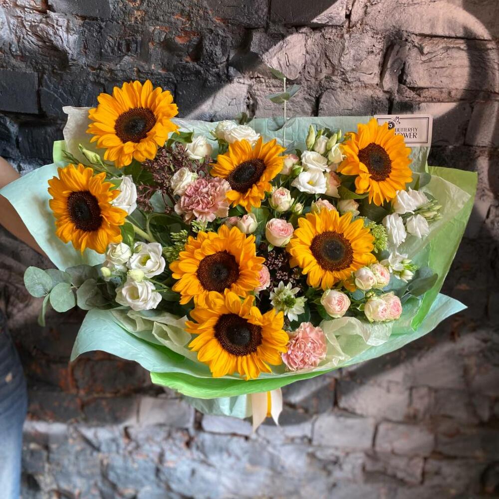 Эвкалипт – 3 шт.Упаковка – 2 шт.Эустома – 5 шт.Диантус – 2 шт.Орнитогалум – 2 шт.Подсолнух – 7 шт.Роза кустовая пионовидная – 4 шт.Седум – 4 шт.