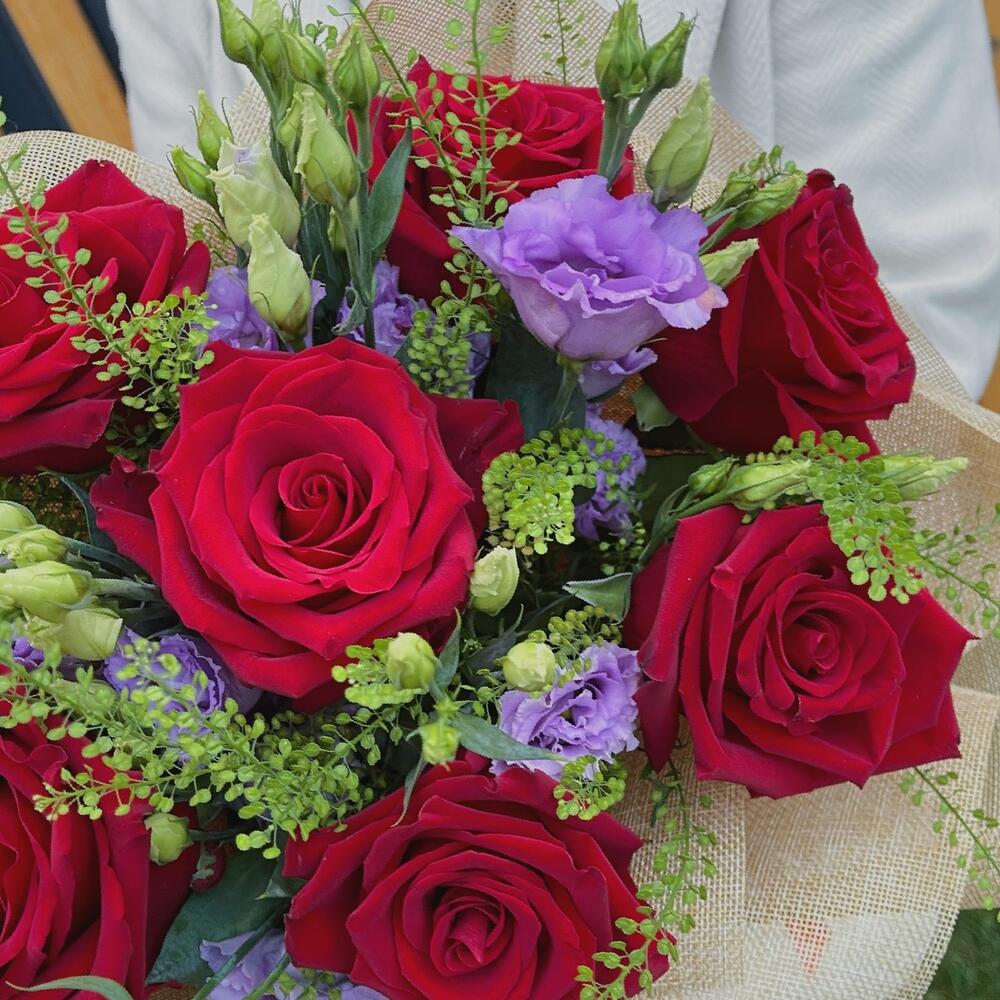 Роза премиум – 7 шт.лизиантус сортовой – 5 шт.Гринбелл – 5 шт.Мешковина упаковка – 1 шт.Лента атласная – 1 шт.