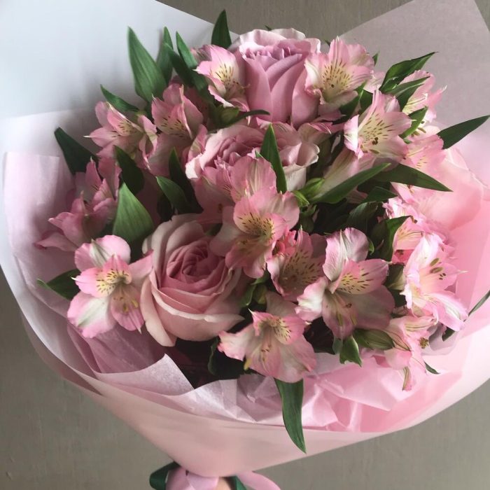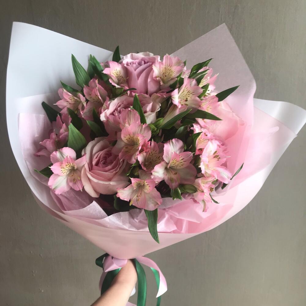 Альстромерия – 6 шт.Роза – 5 шт.Лента атласная – 2 шт.Тишью – 1 шт.Пленка матовая – 1 шт.