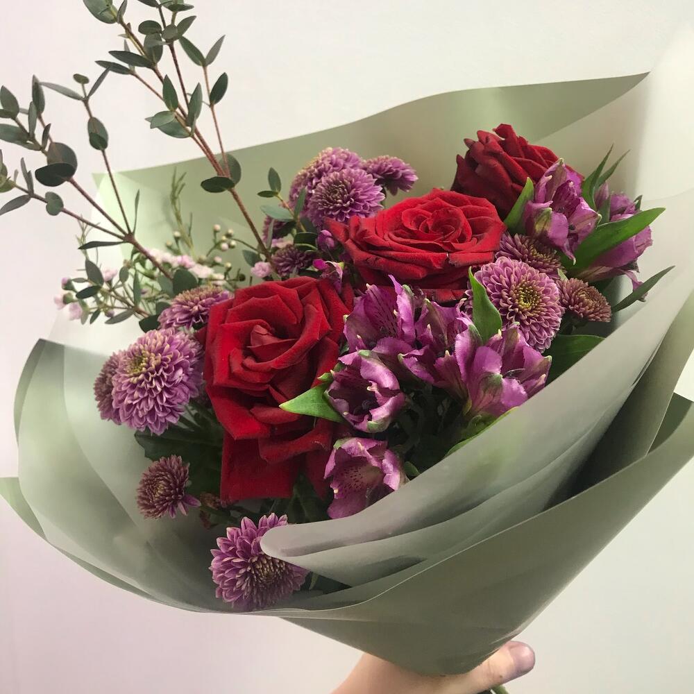 Роза красная – 3 шт.Эвкалипт – 1 шт.Хризантема Сантини – 3 шт.Хамелациум – 2 шт.Альстромерия – 2 шт.Авторская упаковка – 1 шт.Открыточка с вашими пожеланиями – 1 шт.