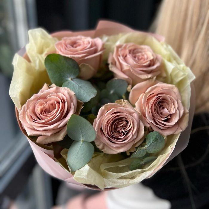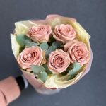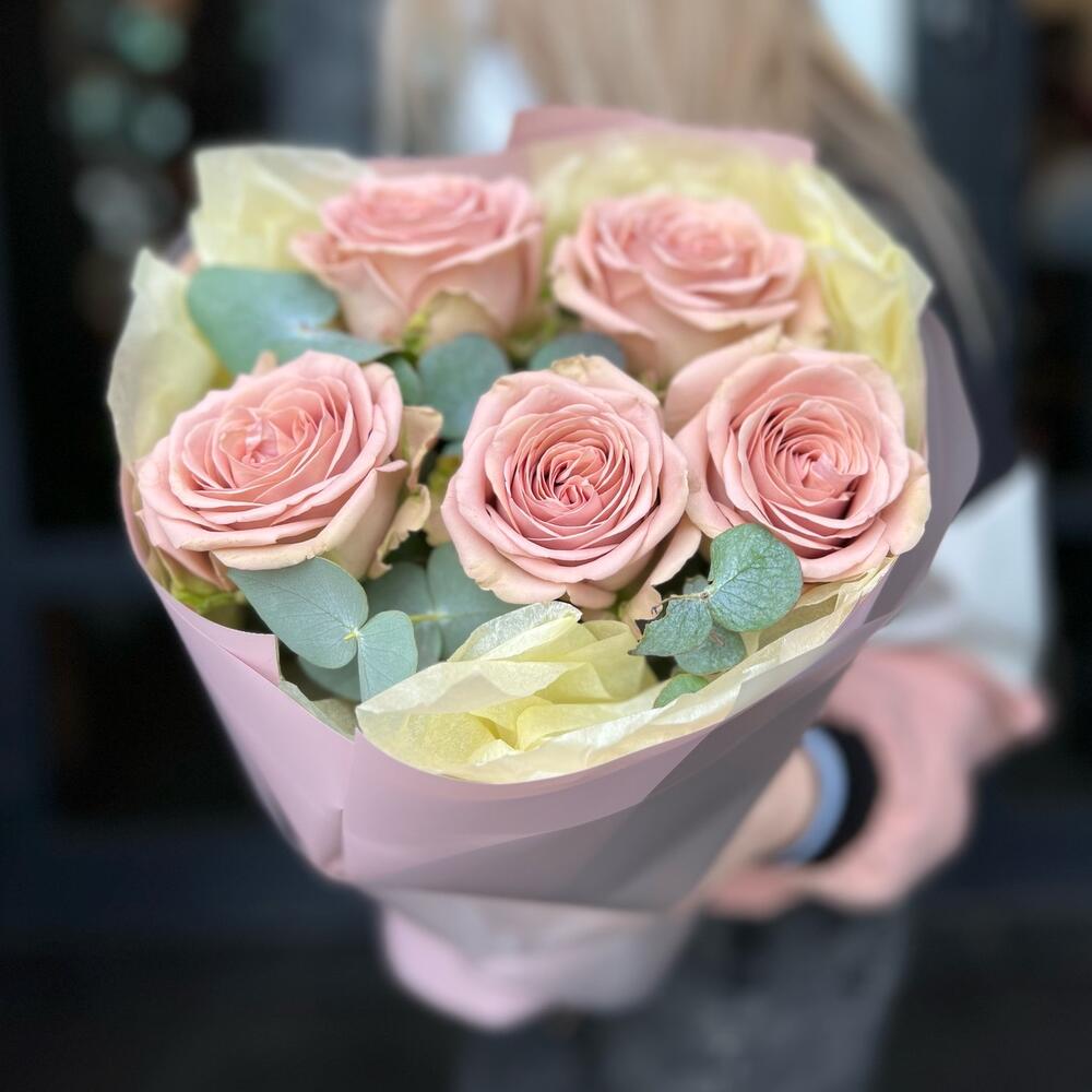 Эвкалипт – 2 шт.Лента атласная – 1 шт.Роза пионовидная – 5 шт.Дизайнерская упаковка – 1 шт.