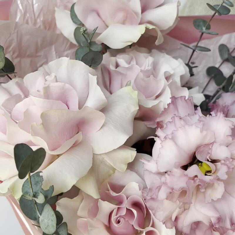 Эвкалипт – 3 шт.Тишью – 2 шт.Фисташка – 3 шт.Упаковка дизайнерская – 1 шт.Роза французская – 5 шт.Лизиантус махровый – 3 шт.лента текстильная – 1 шт.