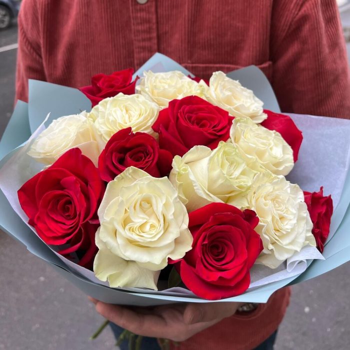 Букет с красной и белой розой 15шт