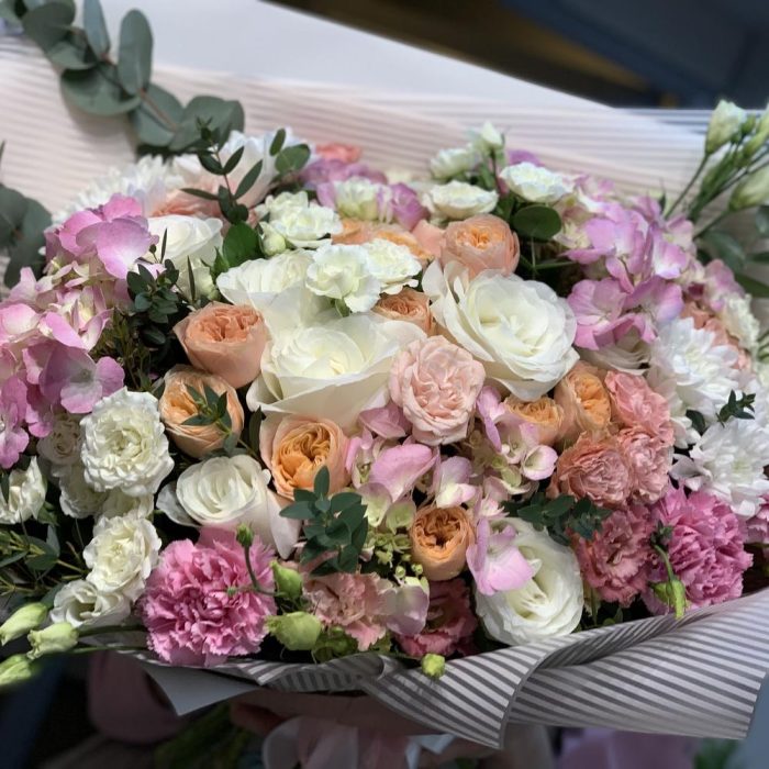 Гортензия – 2 шт.Роза пионовидная вувузела – 7 шт.Роза белая – 5 шт.Роза кустовая – 3 шт.Лизиантус – 3 шт.Гвоздика сортовая – 5 шт.Хризантема кустовая – 2 шт.Эвкалипт – 3 шт.Упаковка дизайнерская – 1 шт.Лента атласная – 1 шт.