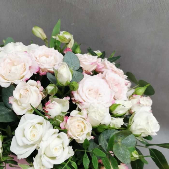 Розовый круглый букет Милано с розами и кружевным лизиантусом