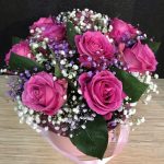 Роза 50 см – 9 шт.Гипсофила – 2 шт.Тишью – 1 шт.Коробка шляпная – 1 шт.