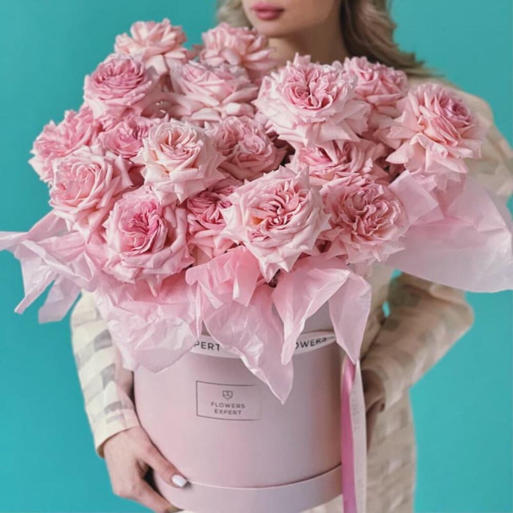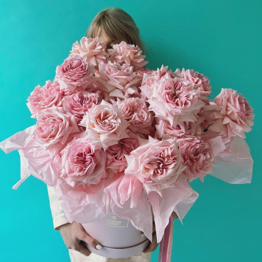Роза пионовидная – 25 шт.Шляпная коробка – 1 шт.