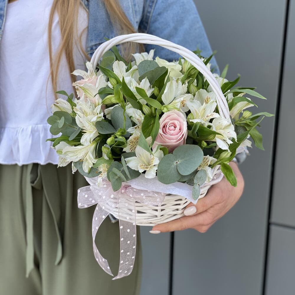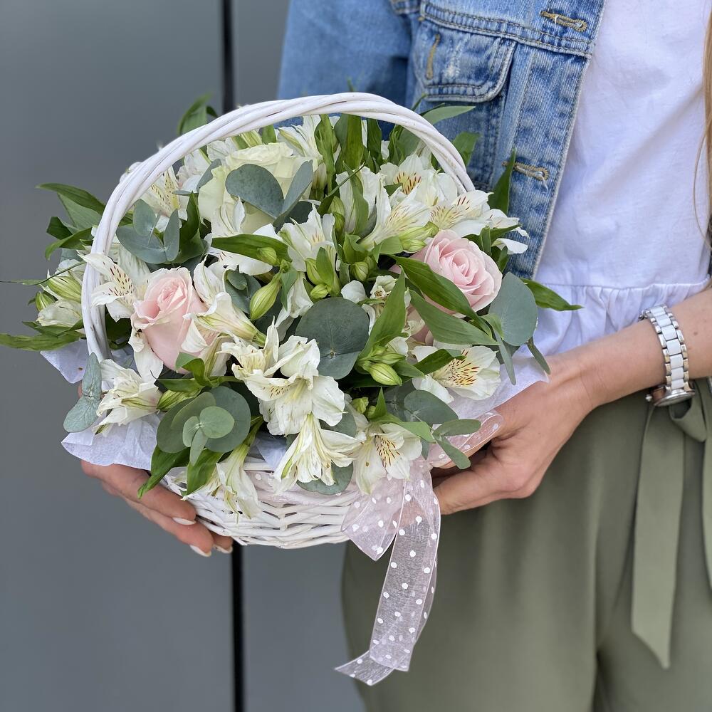Корзина Моя Нежная с розовыми розами и альстромерией