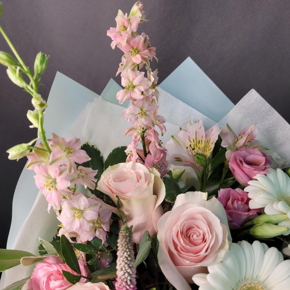 Роза Эквадор – 3 шт.Гербера – 3 шт.Вероника – 3 шт.Диантус – 3 шт.Альстромерия – 2 шт.Лизиантус – 1 шт.Дельфиниум – 2 шт.Диантус кустовой – 2 шт.Питтоспорум – 3 шт.Фисташка – 2 шт.Упаковка дизайнерская – 1 шт.Лента атласная – 1 шт.