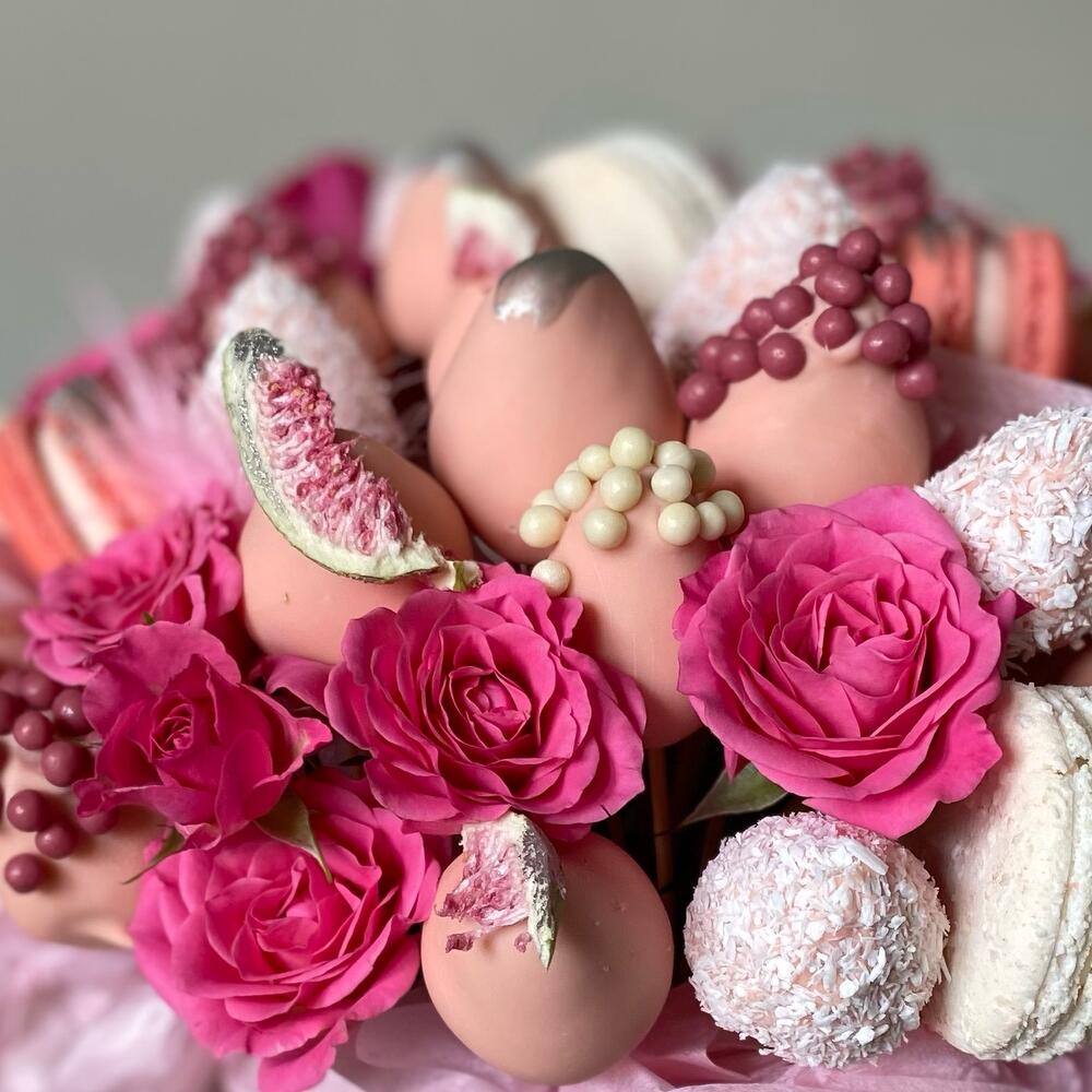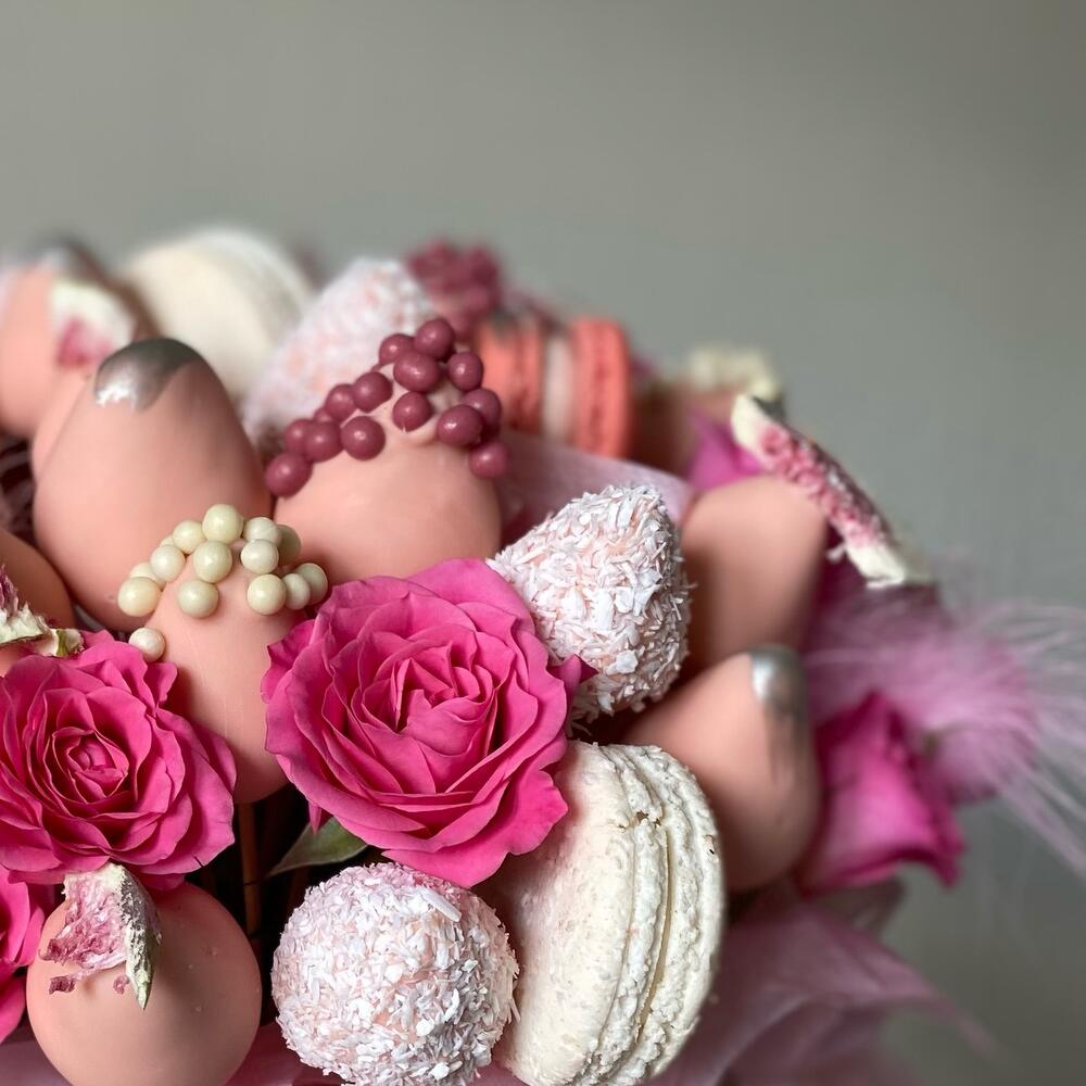 Роза кустовая – 4 шт.Шляпная коробка – 1 шт.Клубника в шоколаде – 20 шт.макарон (пирожное) – 4 шт.