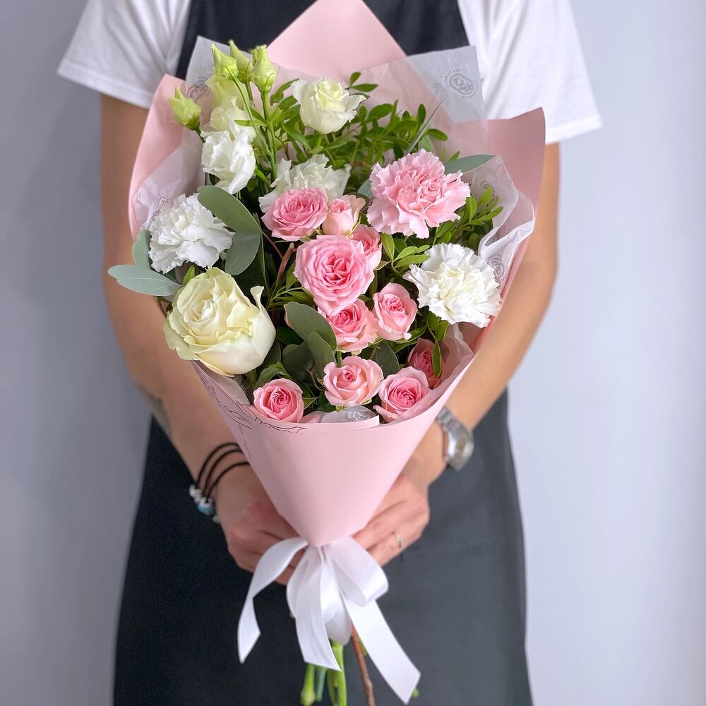 Гвоздики, Лизиантусы, Розы, Тюльпаны