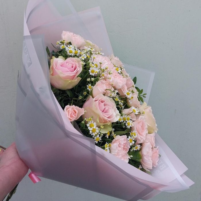 Роза кустовая – 5 шт.Фисташка – 10 шт.Упаковка дизайнерская – 6 шт.Матрикария (Ромашка Камила) – 5 шт.диантус сортовой розовый – 5 шт.фрутетто роза – 5 шт.